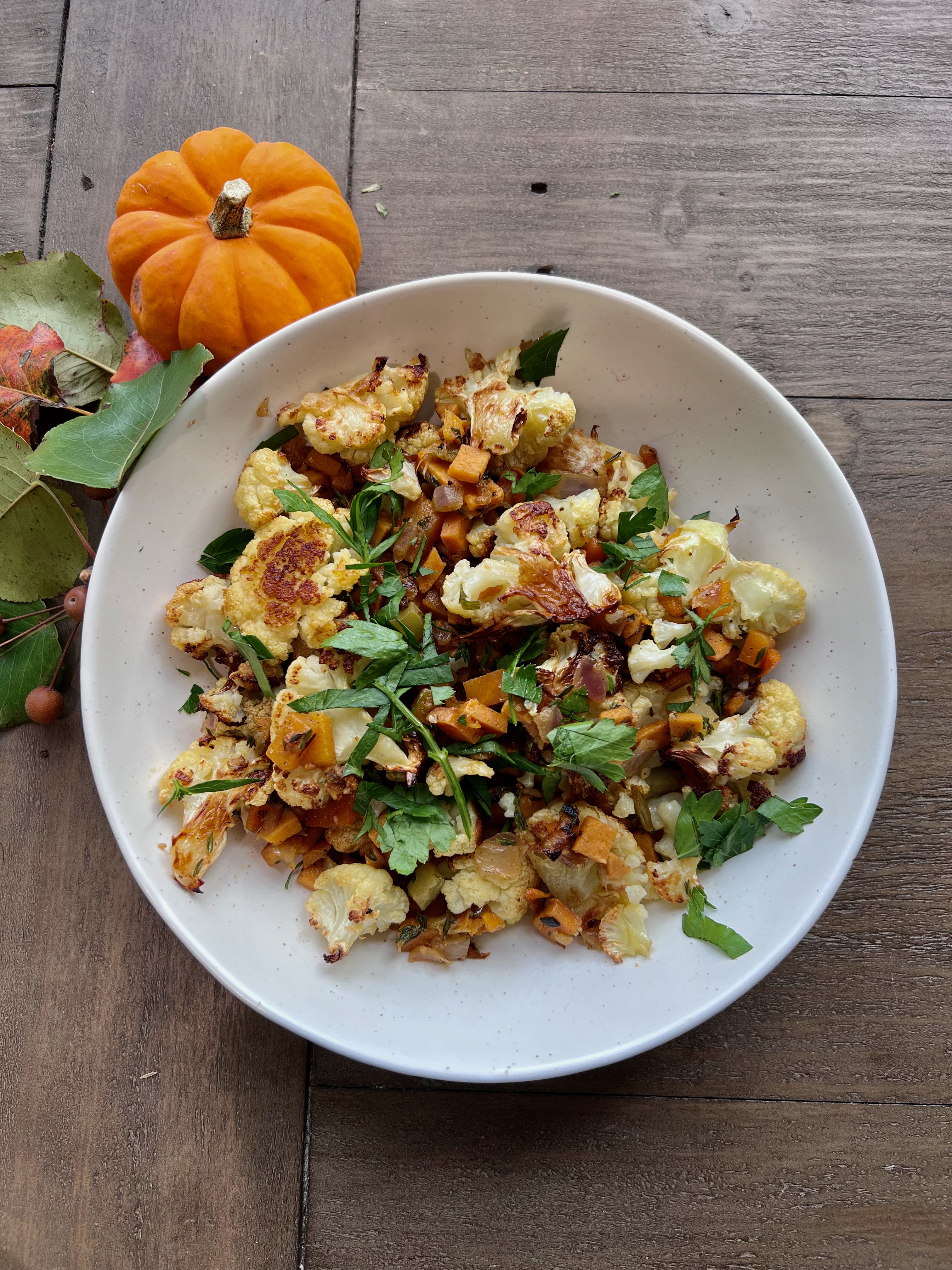 When cauliflower is done add to saute pan add chicken stock simmer until evaporated.. Add the reserved herbs and seasoning if needed .