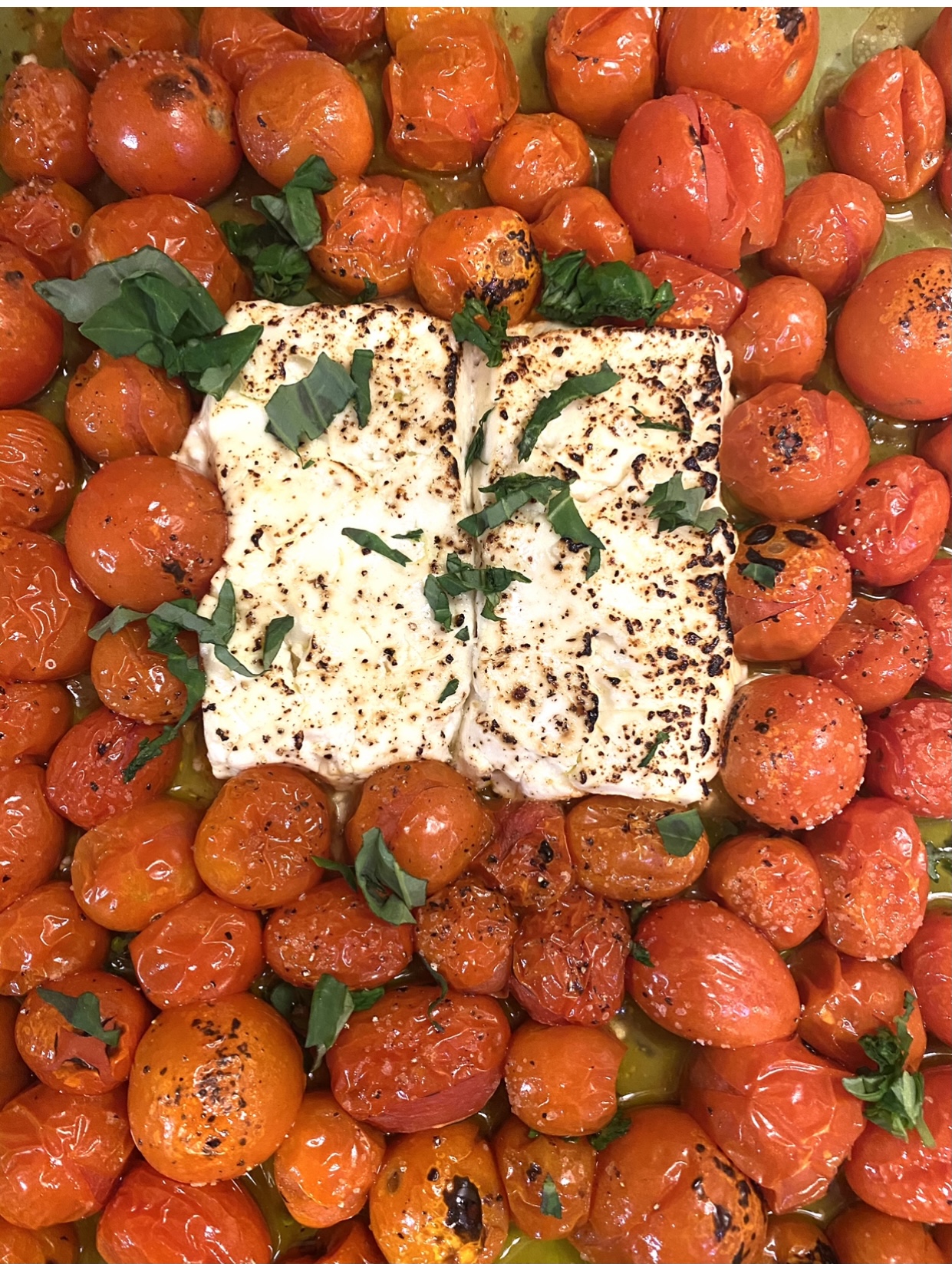 When Feta & Tomatoes are a touched caramelized take them out off oven still in the pan toss torn basil and mix feta and tomatoes until you get a sauce like consistency still have chunks of tomato.