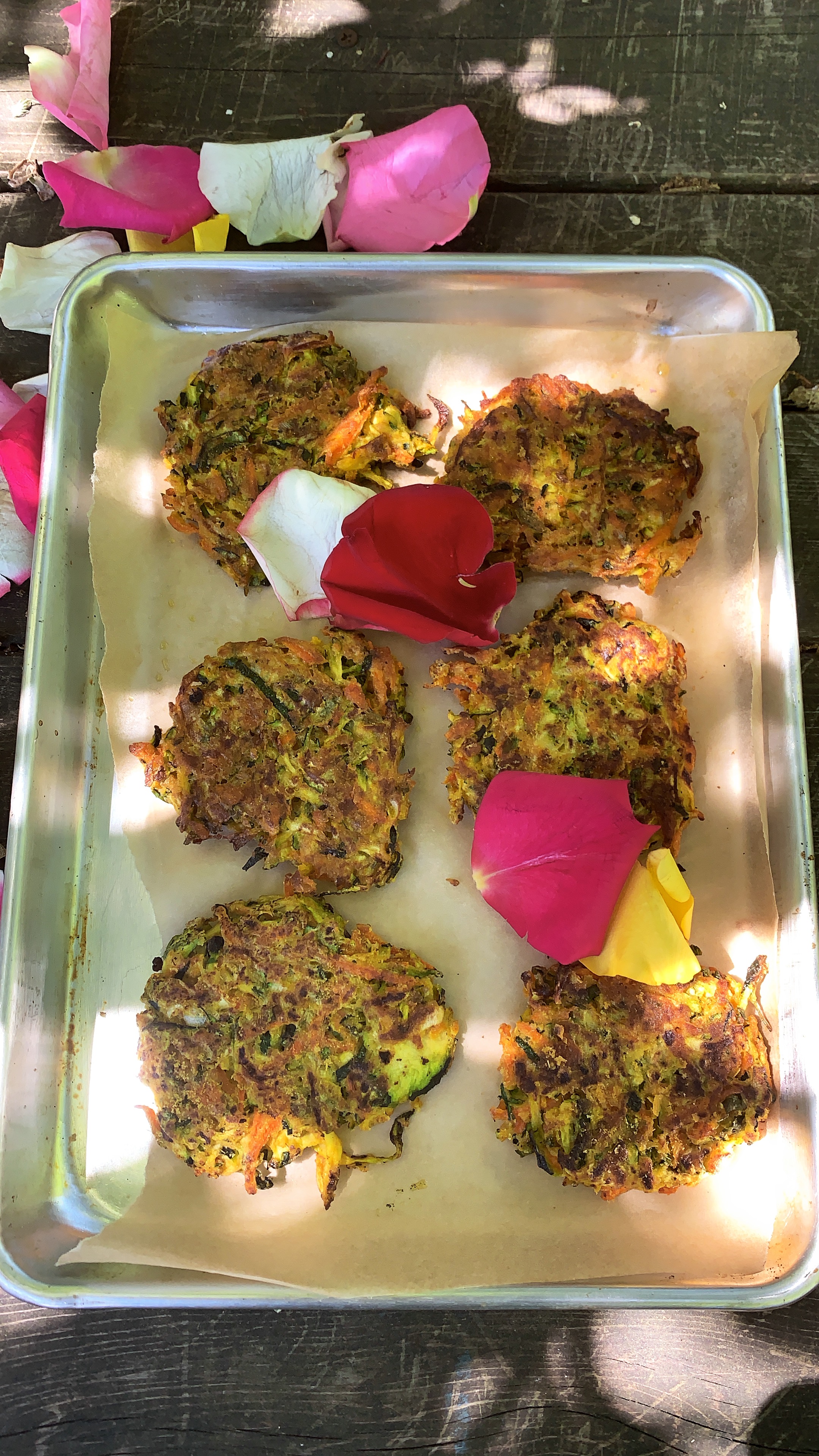 in a medium saute pan add 1/2 tablesppon evoo. To form fritters I like to use a large icecream scooper. Than I flatten down with spatular.