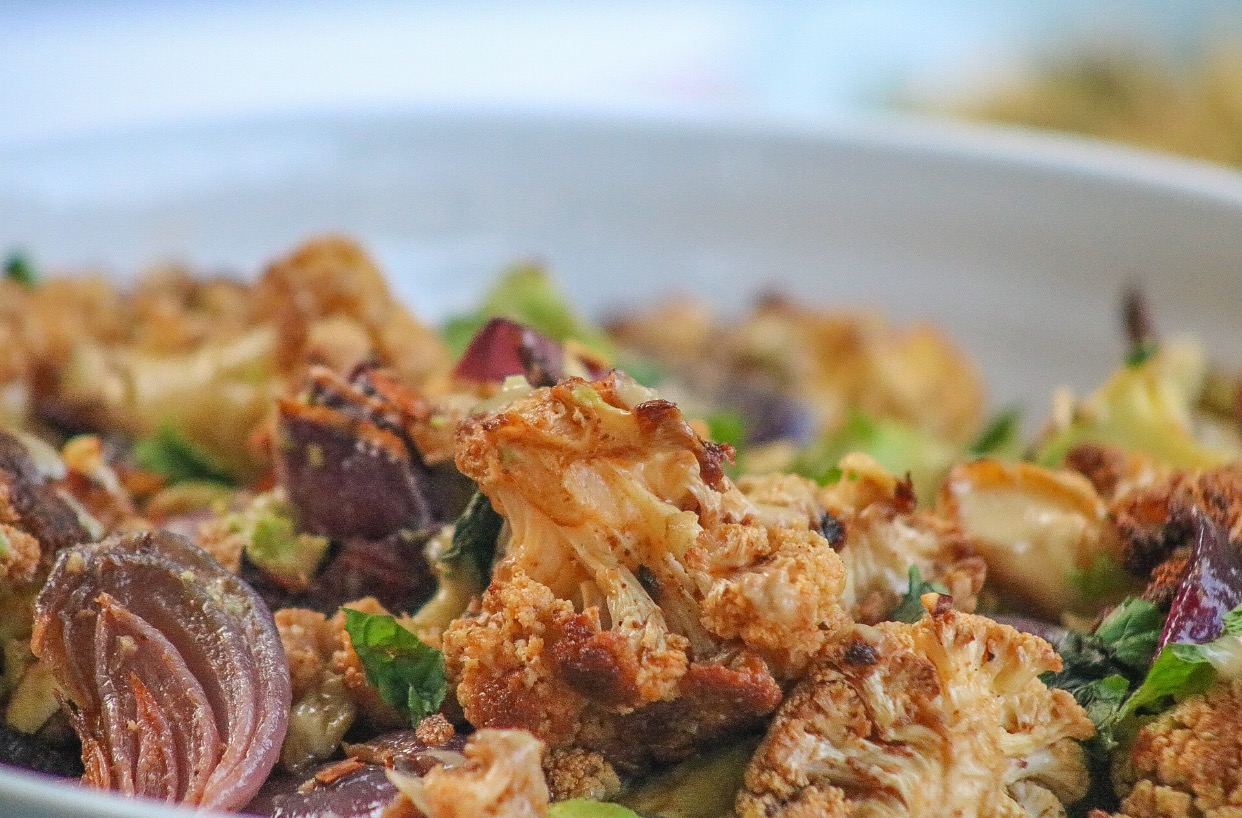 Arrange cauliflower on lined baking sheet. Mix the olive oil with the harissa and pour over cauliflower, make sure it's all coated. Sprinkle with sea salt and roast with red onion wedges for 35-40 minutes. After 20 minutes toss cauliflower and onion wedges to help cooking process. Once tender remove from oven.